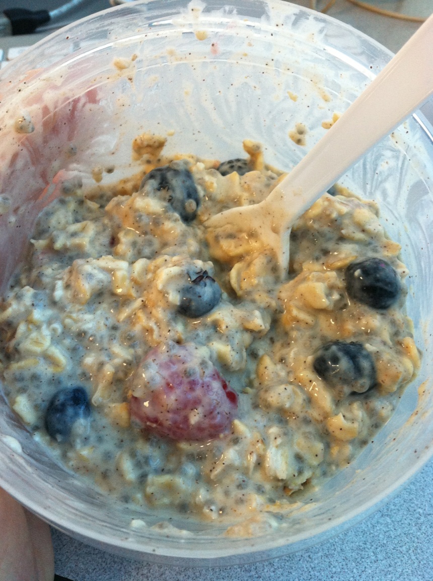 Breakfast this morning was courtesy of my productive self last night. I prepared a bowl of overnight oats last night and washed a bowl of berries that I would stir in this morning before digging in.