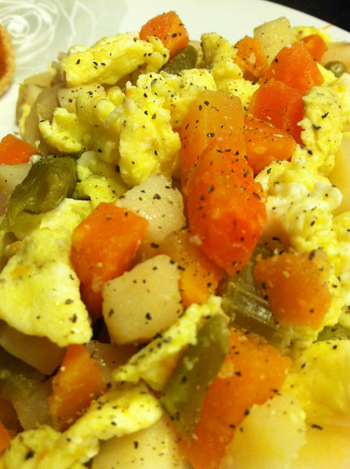 I’m a big fan of the Pam Olive Oil spray for scrambling eggs, so a quick coating of that was all I used to cook my lunch today. Then I whipped 2 eggs with a splash of soymilk and some salt & pepper. While these started cooking, I found a can of mixed veggies in the pantry and decided to toss them into the mix. It was comprised of diced potatoes, carrots, celery, corn, and peas. I let these stay on the heat long enough to heat through and then topped the scramble mix with a touch more pepper.