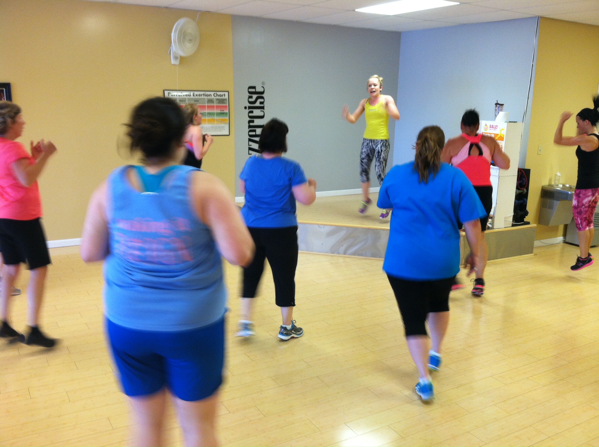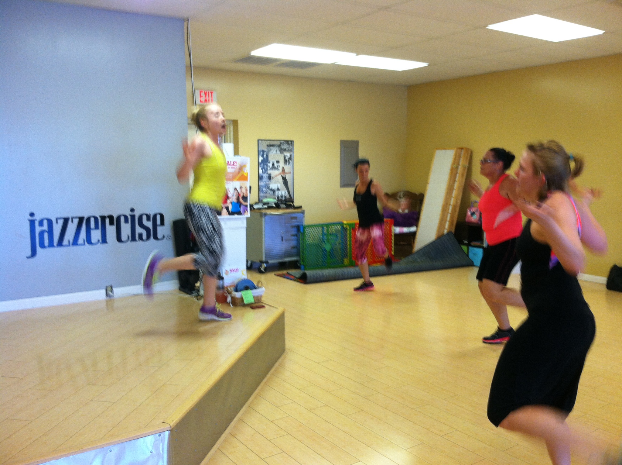 On holidays, we often hold 1 Jazzercise class only and invite our students to bring their friends and family for free. This morning we had an almost-packed house, and I team taught with several of my fellow instructors. We tag team the stage, each teaching a few songs before handing off the mic. So fun! And one of the other instructors was nice enough to snap a few pics of me on stage…