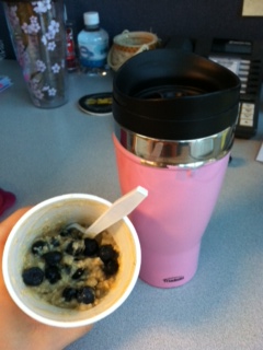 Breakfast today was made in the breakroom once I made it to work a little before 8 AM. I made some oatmeal in the microwave (fancy styrofoam cup style) and threw in some fresh blueberries. I added the blue berries while the oats were still piping hot so they would warm all the way through and get a little soft. It was basically heaven in a cup to my tastebuds this AM. Especially with all the hot coffee I brought to work as well.