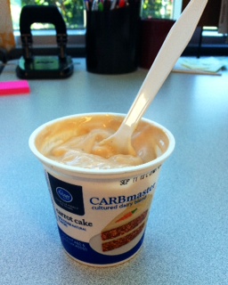 And I’ve gotta rave one more time about my cheapie Kroger yogurt. My snack this morning was the always-delicious Carrot Cake yogurt.