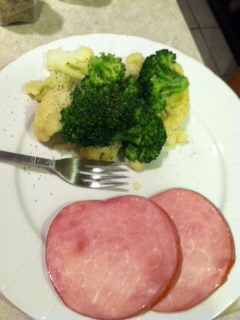 I decided to keep it carb free and go for some steamed broccoli and cauliflower and ham! The mix of warm veggies and ham definitely hit the spot. And I now have leftover steamed veggies for lunch tomorrow. Win!