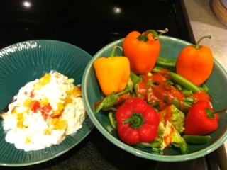 Lunch today was extra quick and half of it was eaten in the car on the way back to work. (I was busy finishing up my bodysculpting music set!) I threw together a salad with romaine lettuce, snap peas, and some more sweet peppers!