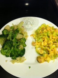 I then quickly showered before my main meal: leftover veggies from last night and shrimp salad that I threw together right before I headed off to class tonight.