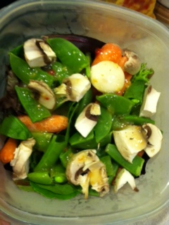 Lunch today came together quick because I threw together a nice chop salad last night so I wouldn’t be so rushed at noon. It contained a spinach spring mix, snap peas, carrots, and mushrooms! A little light zesty Italian dressing topped it off.