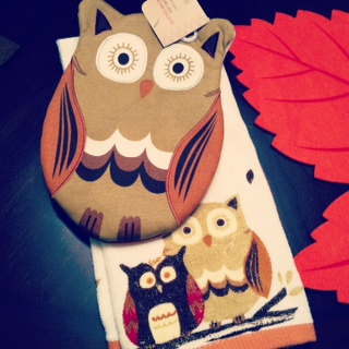 Cute right?! Fall Owl oven mitt and matching dish towel. These are already displayed in my kitchen. They are way too cute to sit in the drawer!! Our house is feeling very festive this evening 🙂