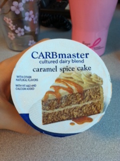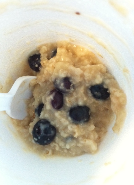 Hot oatmeal with fresh blueberries. Yum! It hit the spot – especially being eaten out of a fancy styrofoam cup. I also had some delicious low-carb yogurt on the side for added protein.