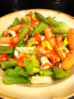 Lunch was easy today! Yes, lunches around here are usually easy, but today’s came together in about 45 seconds flat. I started with my typical green salad, topped with mushrooms, snap peas, and carrots.