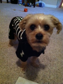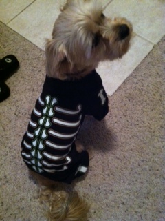 Doesn’t Mac look precious?? Well we think so at least. 🙂 I bought these glow-in-the-dark pajamas as a fun alternative to the typical doggie Halloween costume at Target this past Sunday.