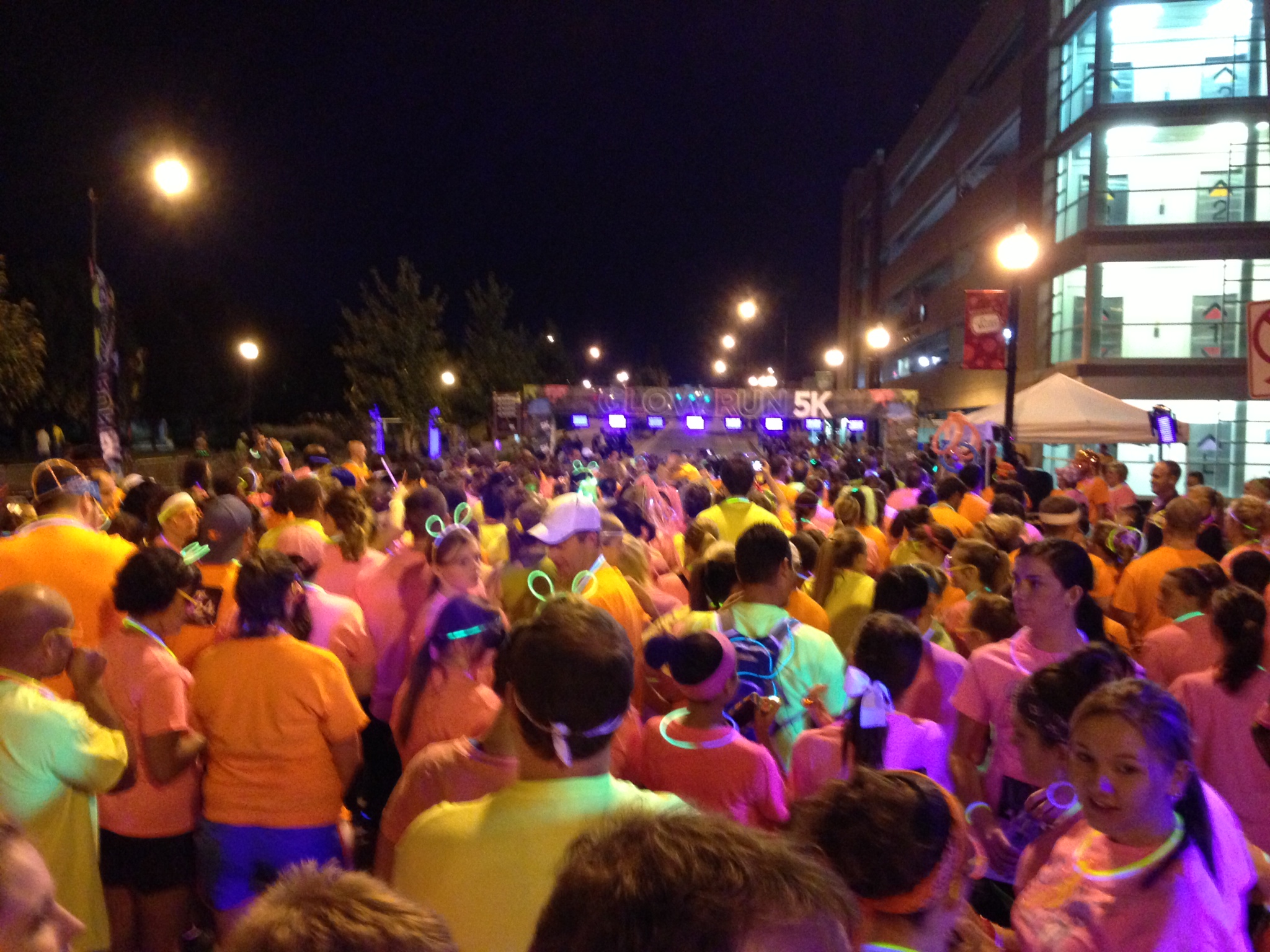 2013-09-14 20.05.11As we lined up, the energy was awesome! Loud music was pumping and glowing neon lights and shirts lined the street for blocks on end. We were so excited! It was Carley’s first race ever, so these last moments were filled with words of advice and positive reinforcement. The nerves were setting in!