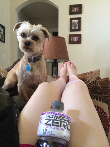 Nick and I headed home for showers and relaxing. I was pretty exhausted after my new PR! Mac watched over me as I put my feet up on the couch.