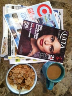I quickly grabbed some coffee and cereal and sat down to stretch while I read through my Sunday paper, aka the Ads and COUPONS!
