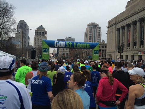 Traffic was light, and we found space in the first parking garage that we came to (right by the Scottrade Center). Hooray! Race day parking always stresses me out. It was fairly quiet around the race corrals, and Nick and I wandered around to stay warm. It was crazy that it was still dark outside! A 7 a.m. race means that your whole morning will be in the dark basically until you take off! So I was pretty entertaining to watch the sleepy runners emerge from the parking garages and hotels. It was like a mob of sleepy zombies was slowly coming together on Market Street. HA!