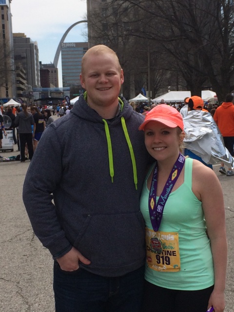After class, I headed back home to wake up Nick and have some more carbs (Greek yogurt and a banana). We had a semi-busy day scheduled: the Go! STL Marathon Expo and lunch with my friend Emily. We met Emily at Noodles & Co. for some last minute carbo-loading during her lunch break. I didn’t take any photos because we got so caught up in convo, but it was really good! I’ve never eaten at one before, and I must say it was amazing! I had a pesto pasta with parmesan-crusted chicken. It was SO tasty, and I ate every bite of my meal. And it was nice to catch up with my best friend too. 🙂  Nick was a good sport and listened to our girl-talk for the hour before she headed back to work and we headed over to the expo.