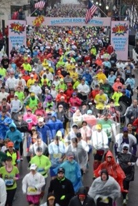 Once we were all set to go, we made our way to Downtown Little Rock to get parked and find my corral. It sprinkled lightly on us during the drive over, and all I could do was pray that it would pass and not get any worse. But it didn’t work. The rain was coming down regardless of my pleas, so I zipped up my raincoat in an attempt to keep me dry through this race.