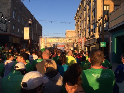 I wore the exact outfit I wore to the Little Rock Marathon minus the rain jacket! When you find a good race outfit that doesn’t chafe in all the bad places, stick with it! 🙂 The sun was still coming up as we lined up right outside the Expo Center to start the race. It was around 50 degrees with a beautiful forecast for the whole morning.