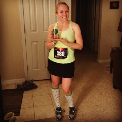 I let them pull away and I settled into a more comfortable pace of around 8:40 per mile. That sprint out of the porta potty killed me but I was too determined to keep up! The rest of the course I was alone mostly. I passed a few ladies here and there but so thankful when I hit mile 13. I was bored of being by myself! But we hit a major hill – the biggest of the race – right at mile 13, so that helped my focus come back to the race and ran as hard as I could up that darn hill. I came around the corner of the Expo Center to see Nick cheering for me at the finish.